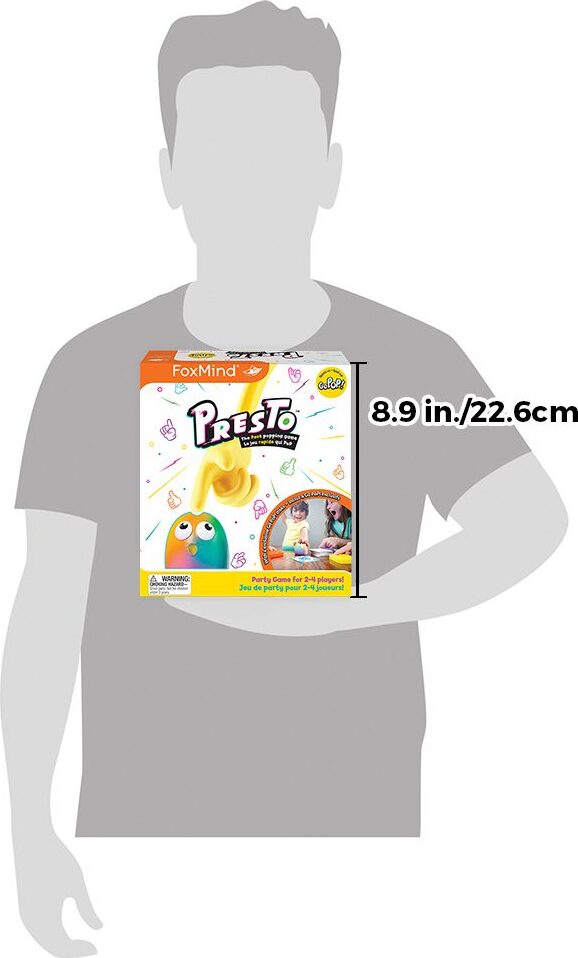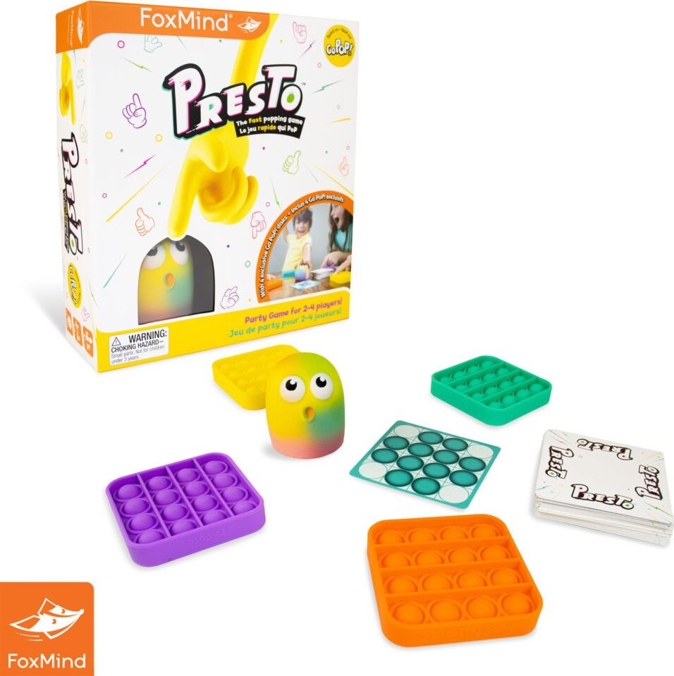 Introducing Presto! With the cute bubble character from the Go PoP! line. Race to pop the bubbles! Complete the challenges on the presto Cards and be the first to tap Bubblo to win the round! Players with quick reflexes, excellent eye-hand coordination and a good sense of observation will prevail in this fun party game for the whole family.