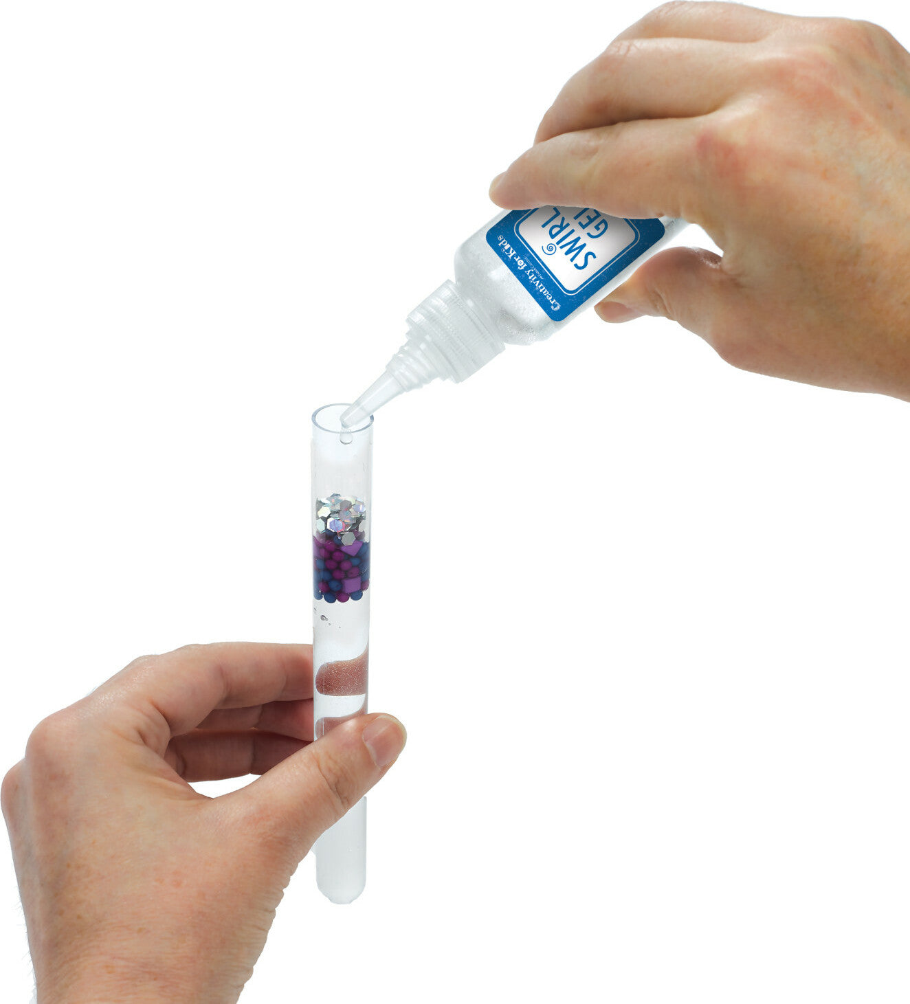 Two interchangeable swirl tubes are included for fun optical effects. Fill them with glycerin swirl gel, then add an array of colorful confetti accents.