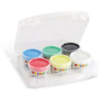 Specially designed for use on textiles, this finger paint set includes 6 colours in 100g pots.