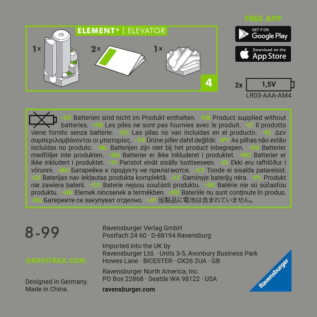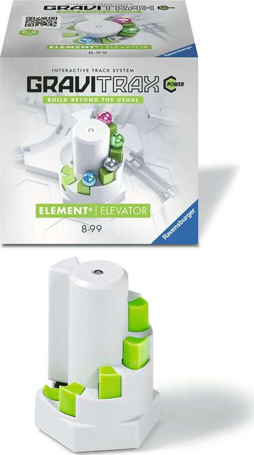 Going up! The "GraviTrax POWER Elevator" will lift your marbles up 7 levels — automatically! The motorized Elevator recognizes when a marble is at the first step and transports it up and up, step by step! No manual reset is needed as the next marble takes its turn to move up and race on. A great addition to Ravensburger's "POWER Launch Starter-Set" or any GraviTrax Starter-Set! Experience the power of gravity and educational fun today!