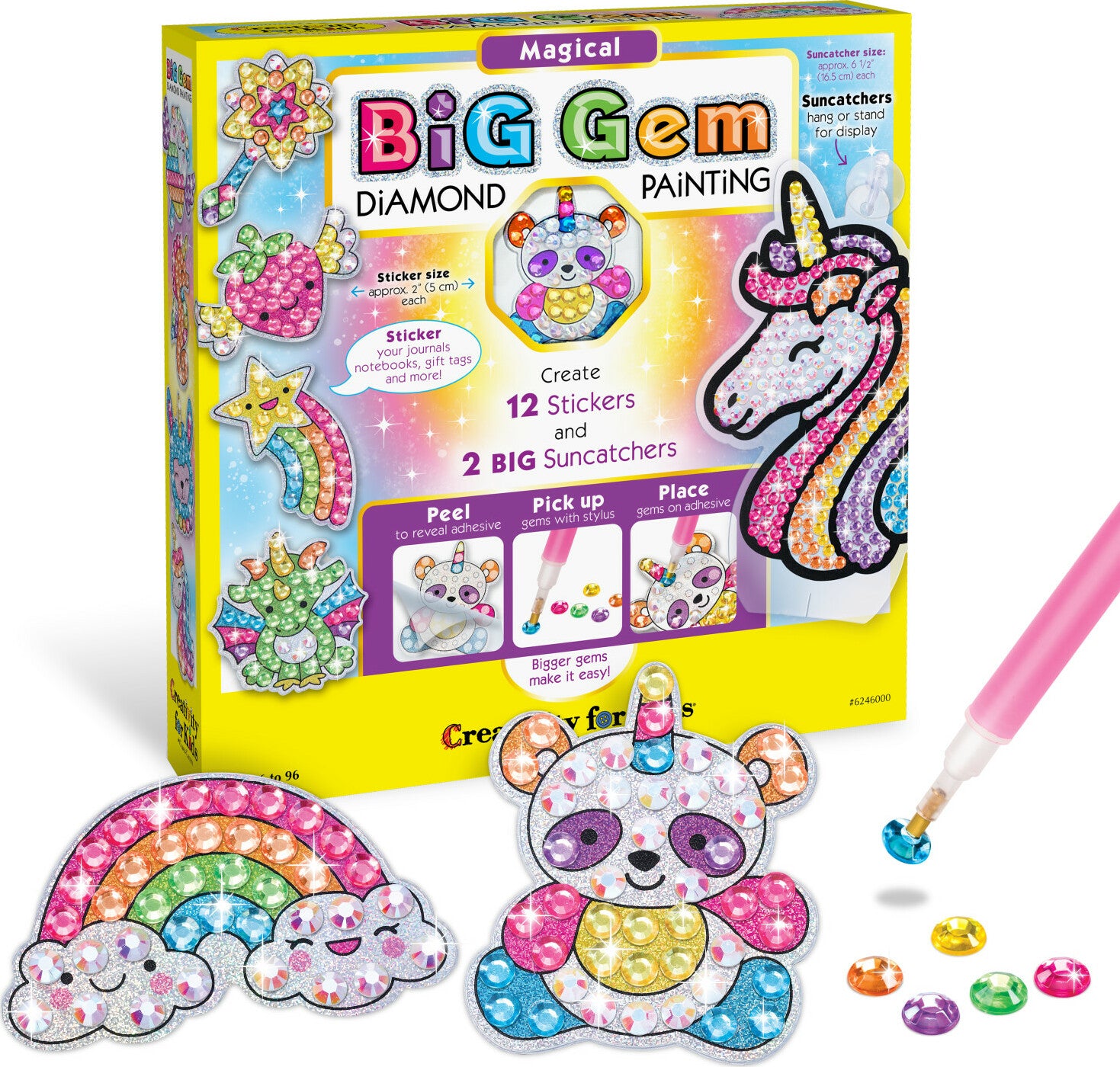 Apply your Big Gem Magical stickers to journals, cards, notebooks, pencil cases and so much more. Display your suncatchers using the stands or included suction cups.