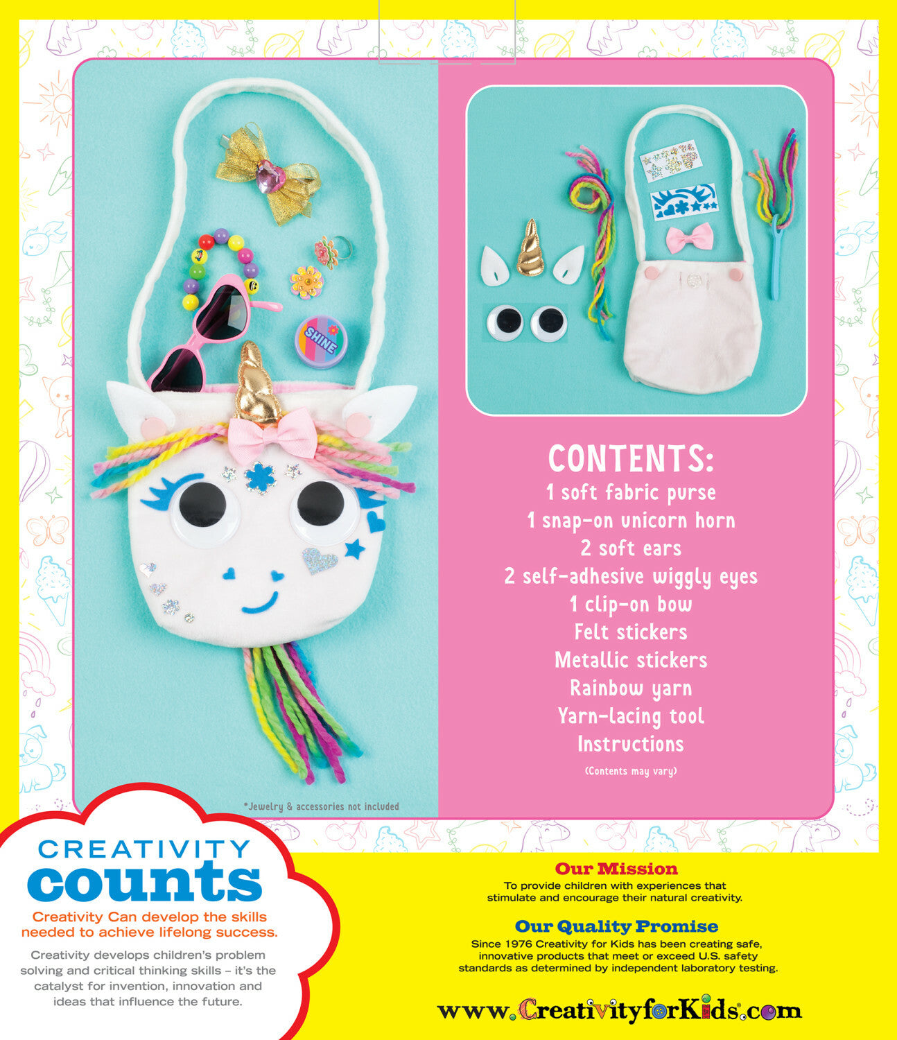 Transform this no-sew bag into a super-soft, velvety unicorn purse. Designed with little fingers in mind, this beginner craft develops fine motor skills, fosters creativity and promotes self-expression.