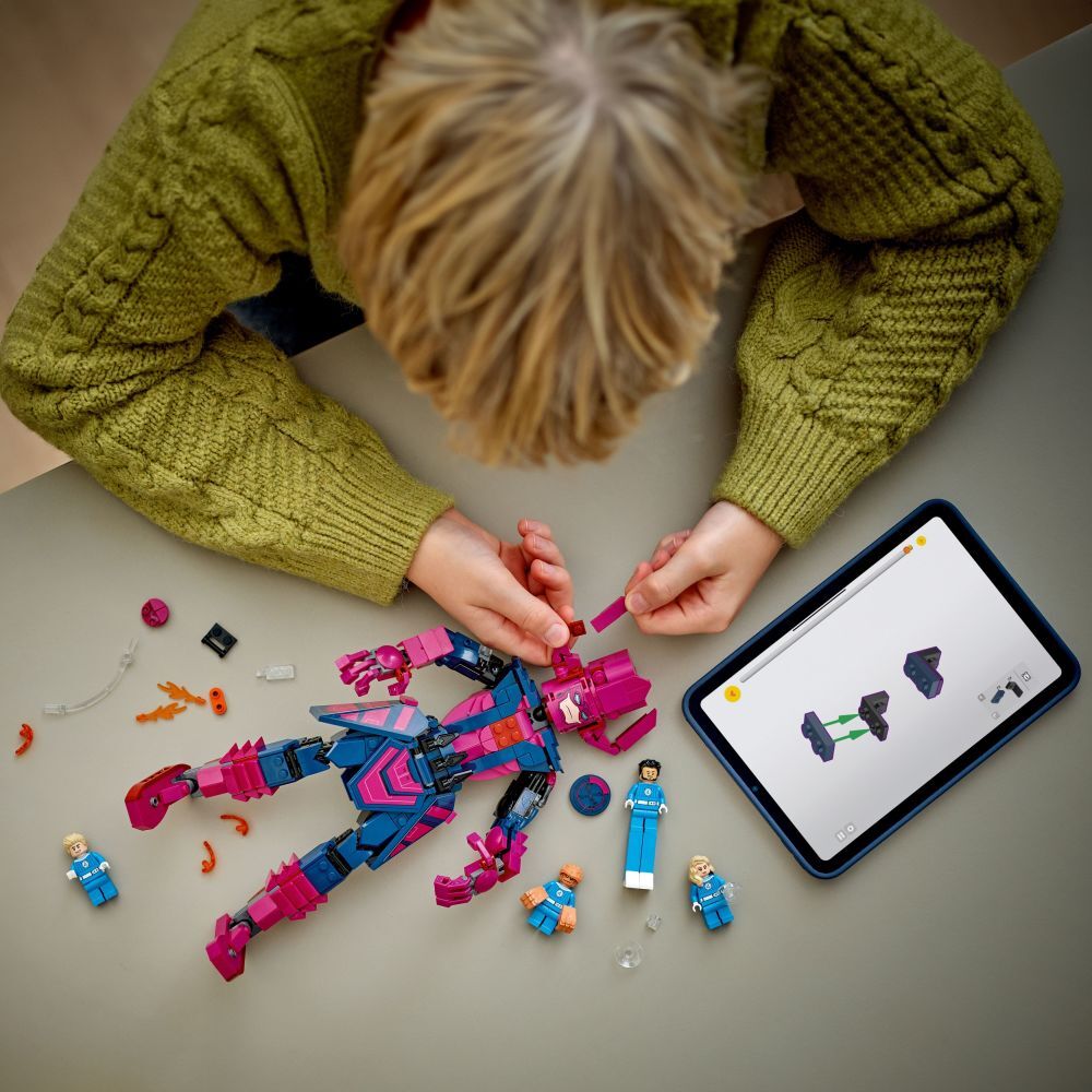 The buildable LEGO Marvel Fantastic Four toy includes 4 minifigures: Mr. Fantastic, featuring extendable legs; Human Torch, with 2 hand blasters and flame elements attached to his feet, plus a transparent support that enables him to 'fly'; Invisible Woman holding 2 force shields; and The Thing with his large, powerful hands. A fully jointed construction figure of the movie's iconic villain, Galactus, stands over 11 in. (28 cm) tall. This posable construction figure prompts endless action as he battles the Super Heroes. For added digital fun, builders can zoom in, rotate models in 3D and track progress using the fun, intuitive LEGO Builder app. Set contains 427 pieces.