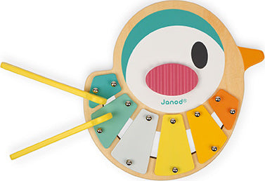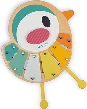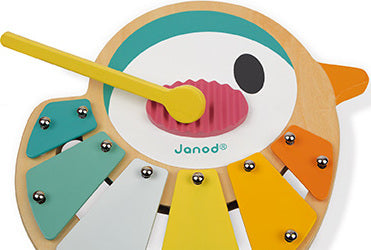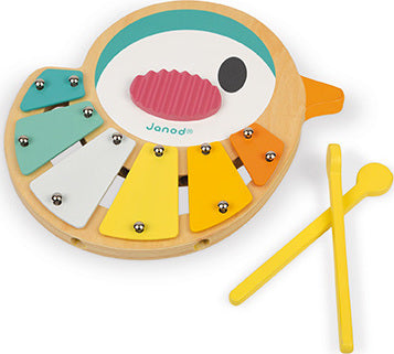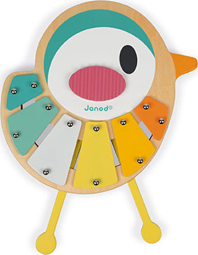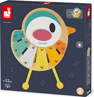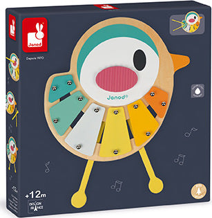 A lovely 6-note xylophone shaped like a small bird featuring very soft, very modern colours. Its legs become sticks then may be stored inside! With anti-skid feet for greater stability. Waterbased painting. Wood : plywood. Closed colour box