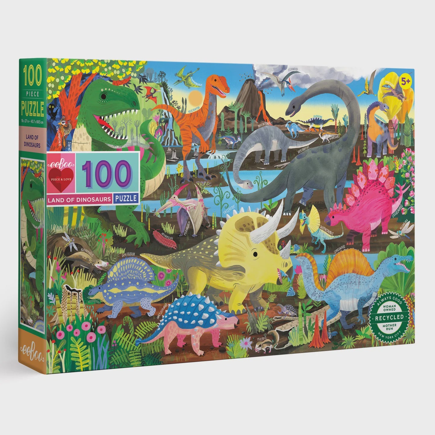 Land of Dinosaurs 100 piece jigsaw puzzle is the perfect puzzle for young paleontology enthusiasts! This giant, floor-sized puzzle features triceratops, stegosaurus, brachiosaurus, and other dinosaurs living in perfect harmony!
