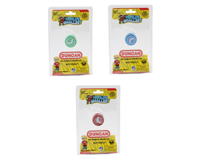 Introducing the Super Impulse World's Smallest Duncan® Butterfly® Yo-Yo Assortment. The legendary Butterfly Yo-Yo has been beloved for over sixty years and is now available in its smallest size yet. Measuring just one and a half inches in diameter, this yo-yo offers the same iconic wide-shaped design as the original in a more compact size. This tiny version comes in three vibrant colors, and each assortment pack is randomly selected, adding an element of surprise to each purchase with the chance to receive all three colors. This assortment pack is the perfect choice for Easter baskets, stocking stuffers, or party favors, offering fun for all ages six and up.